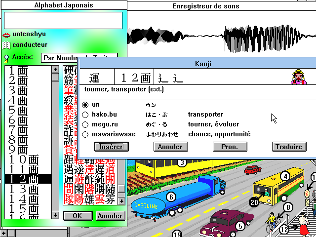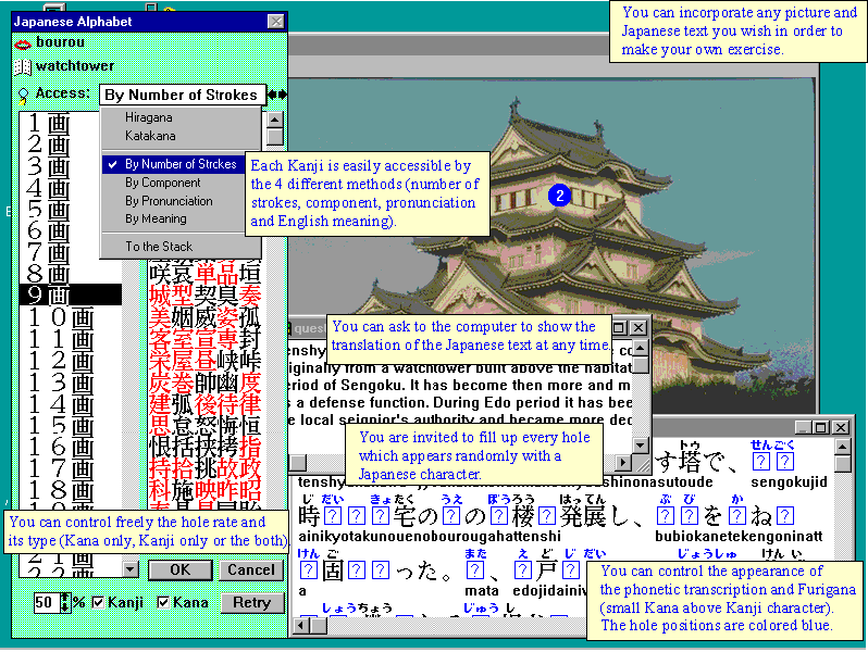 dessins en couleur. Chaque caractère Kanji peut être accédé de quatre différentes
